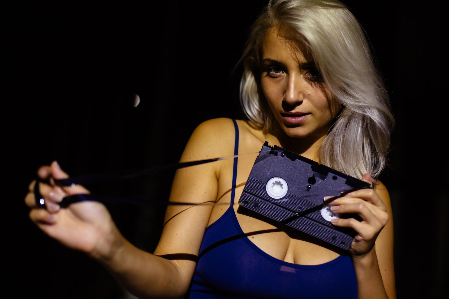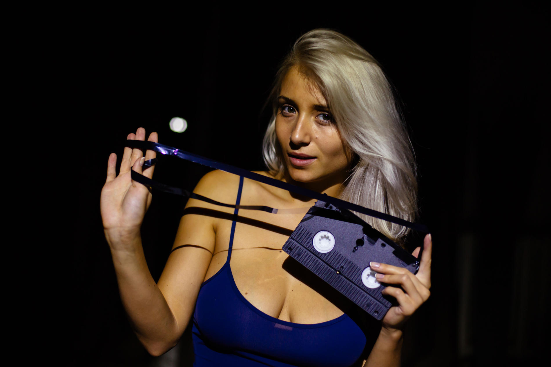 красивая с большой грудью балуется с пленкой от видео кассеты