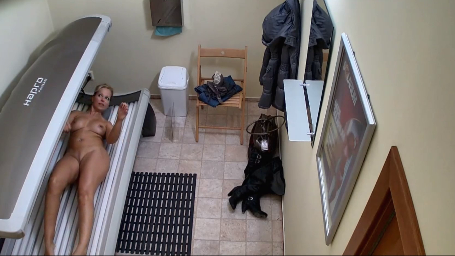 Красиво нежится в солярии зрелая блондинка с аппетитным телом!
