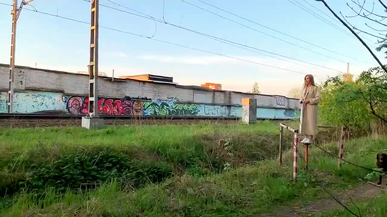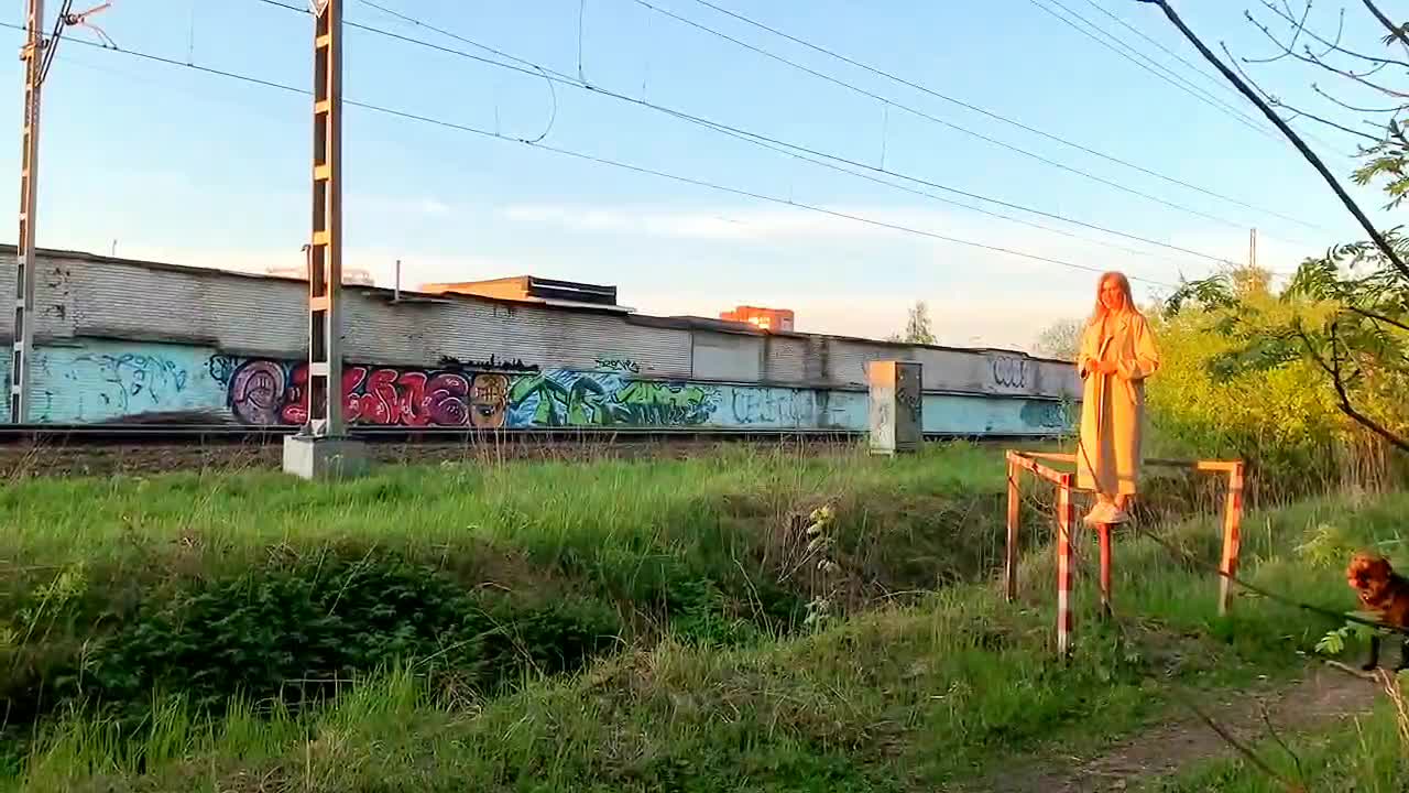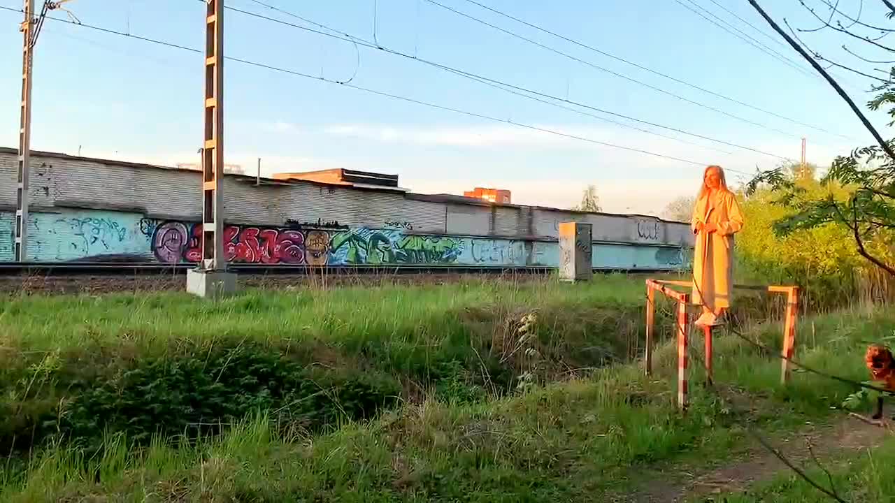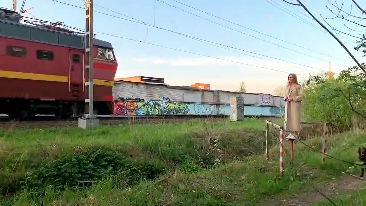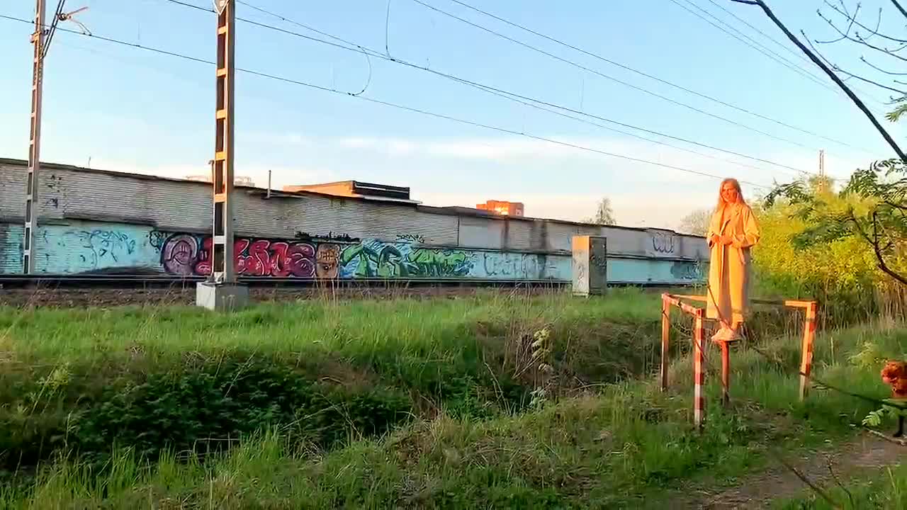 Девка показывает себя пассажирам проходящего поезда.