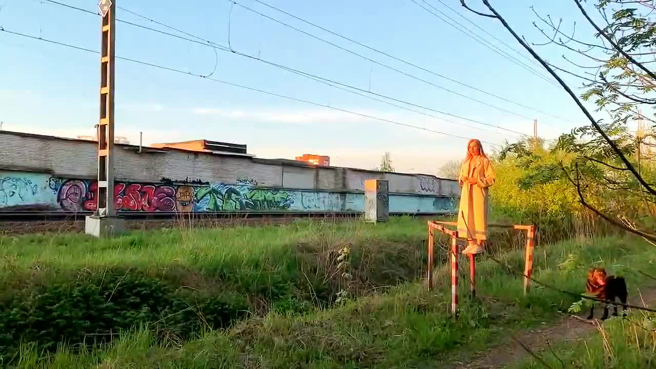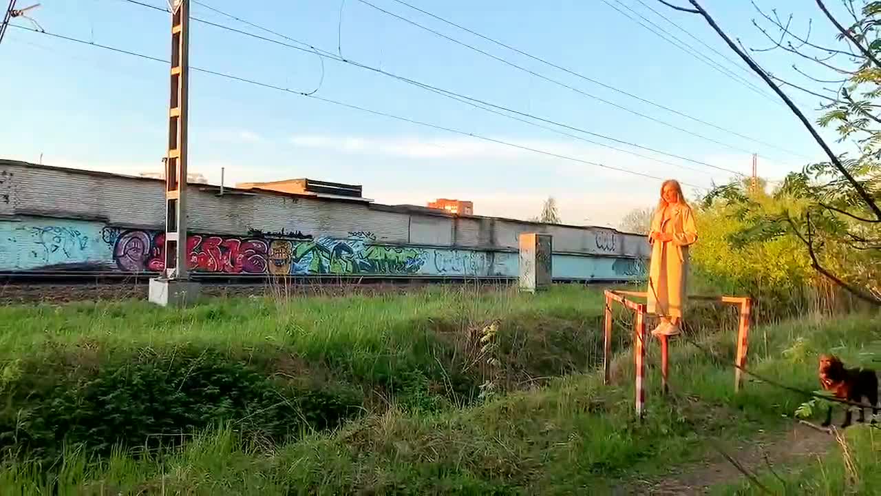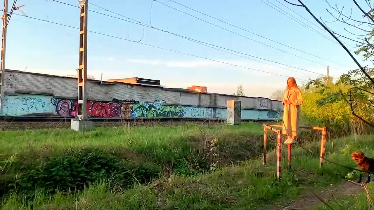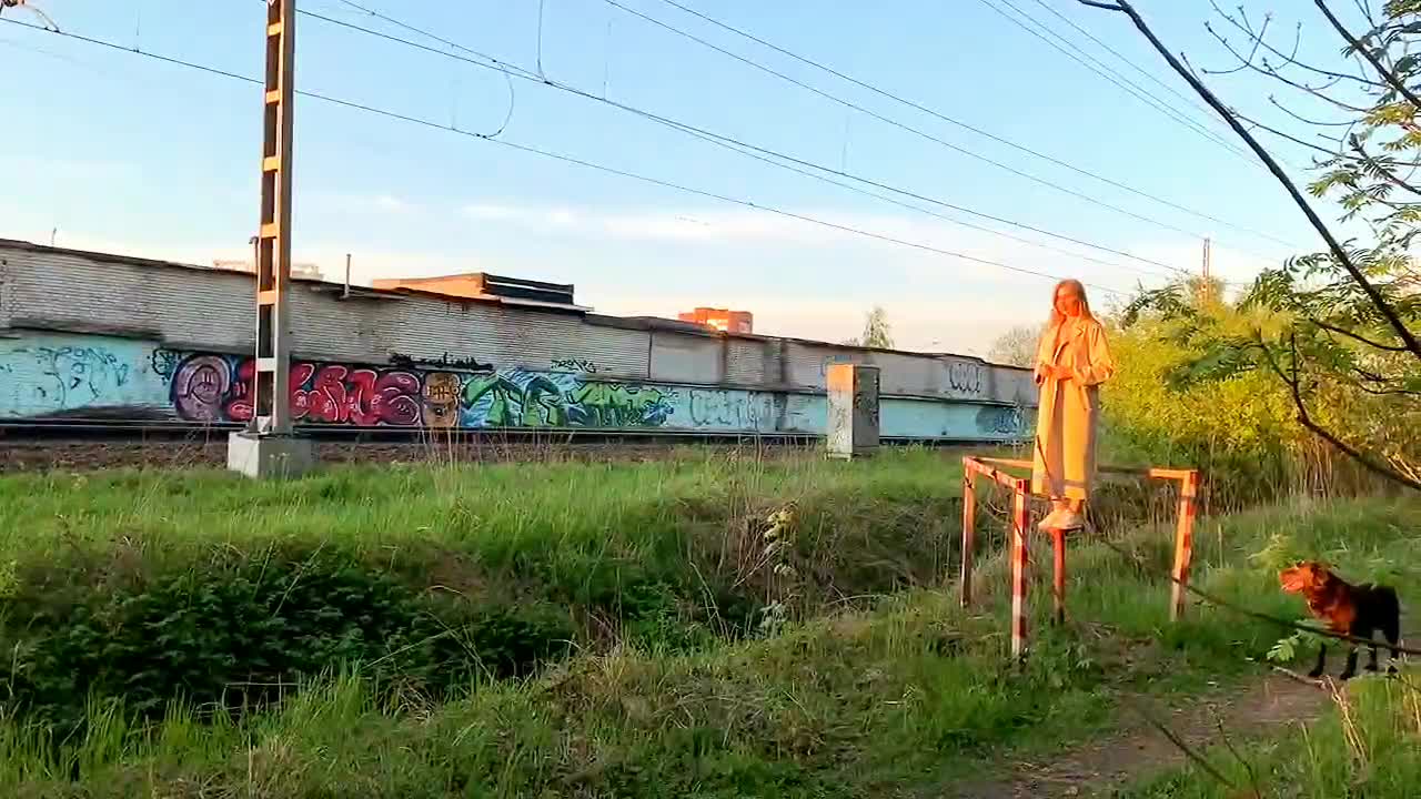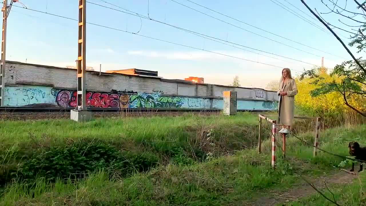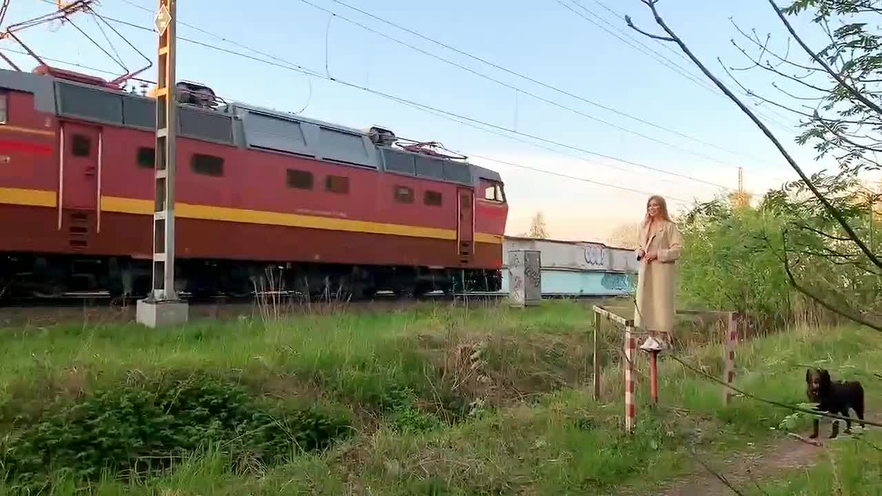Девка показывает себя пассажирам проходящего поезда.