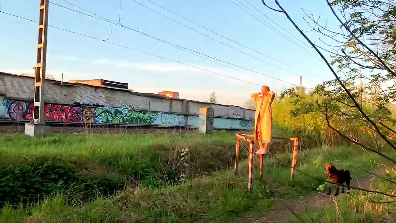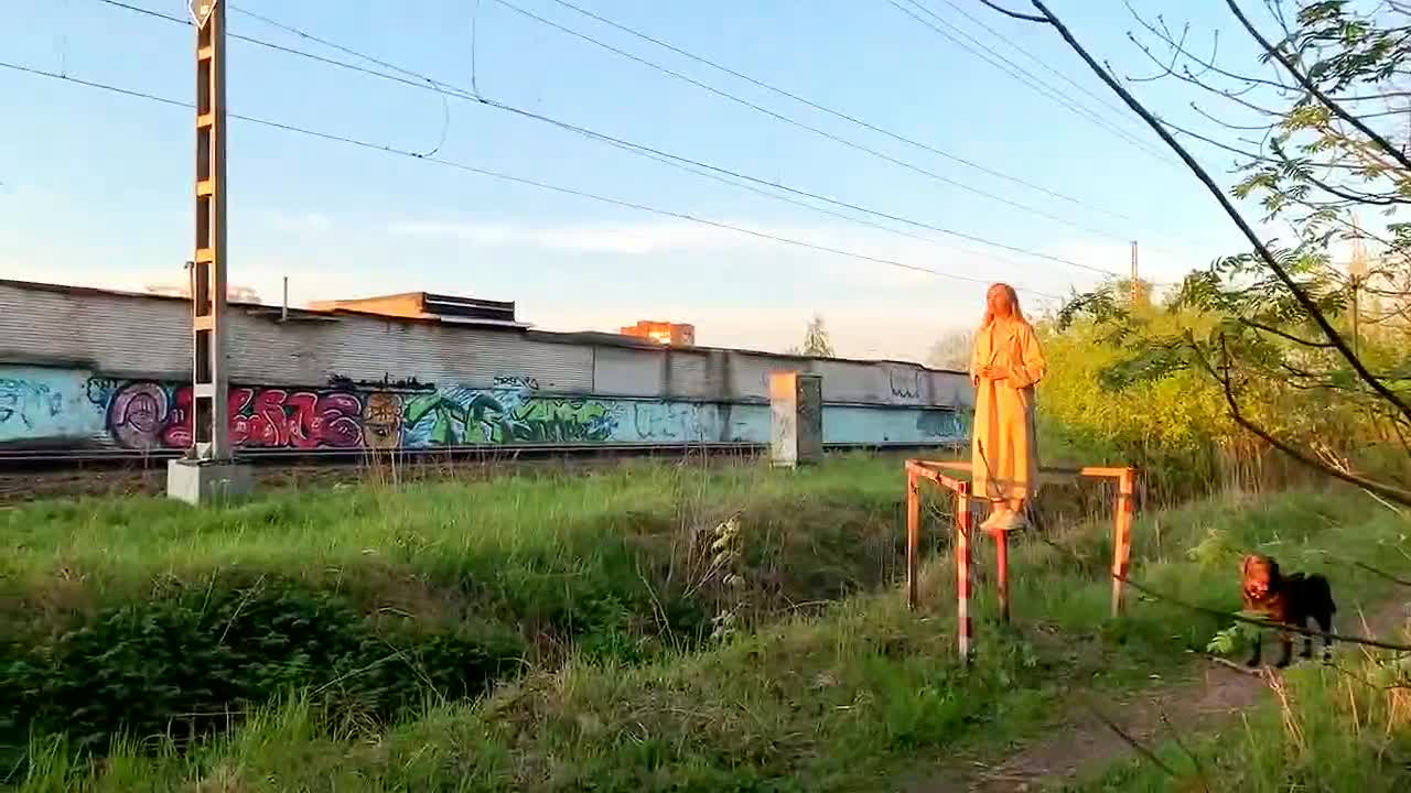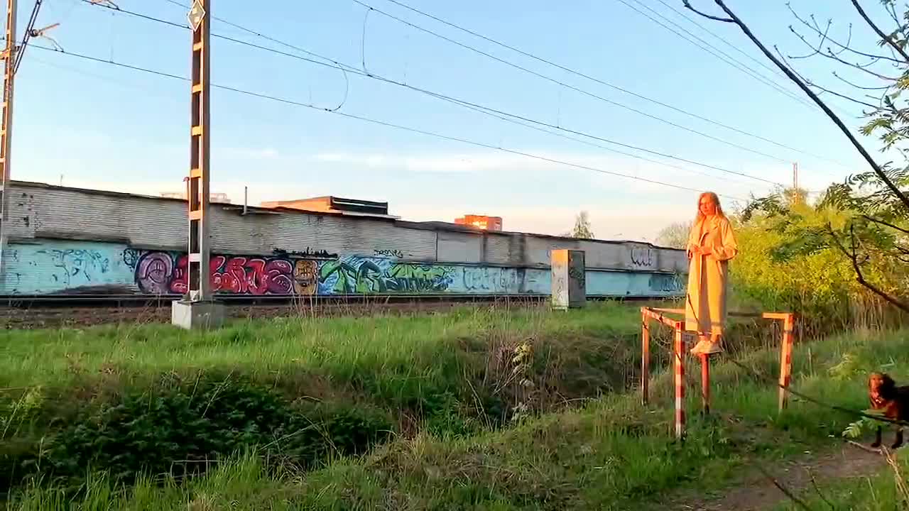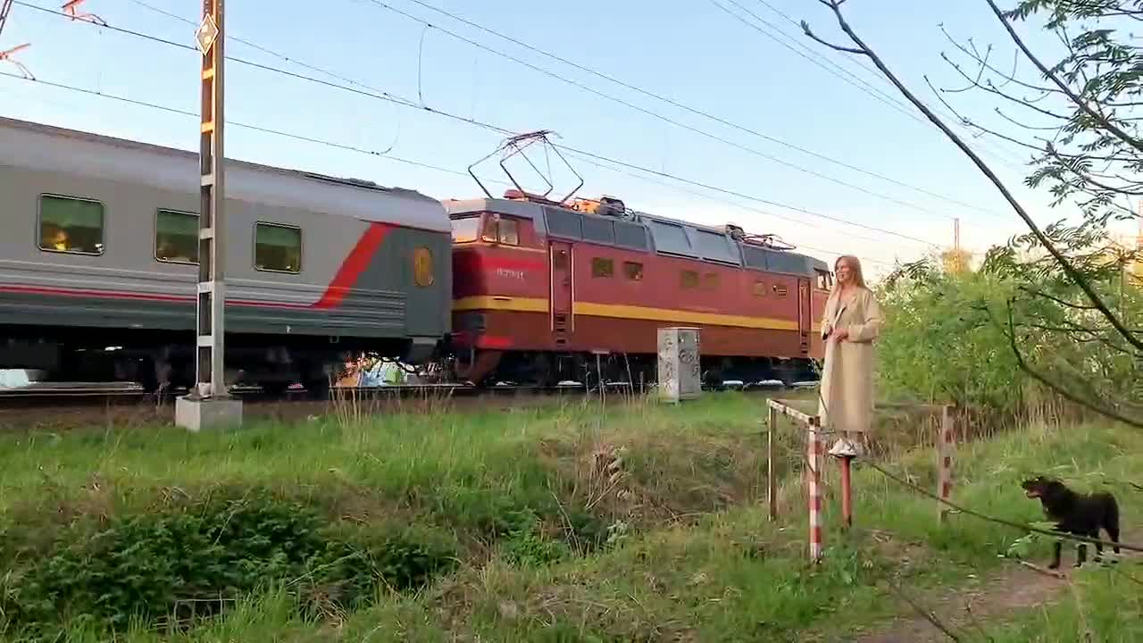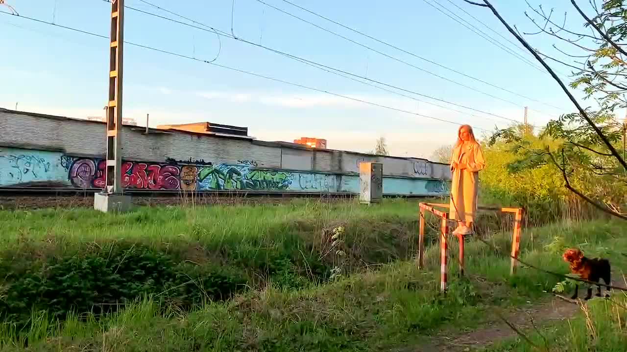 Девка показывает себя пассажирам проходящего поезда.