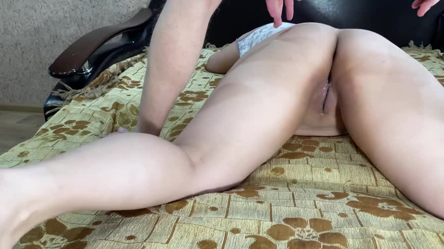 Трахнул жену на диване лёжа на животе в её бритую киску с финалом на её попку