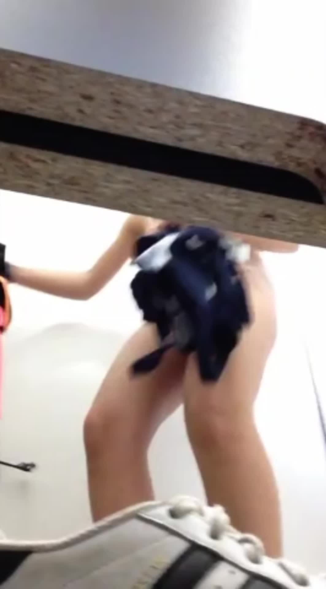 Сисястая с волосатой писькой девушка, мерит купальник, пока ее снимает скрытая камера.