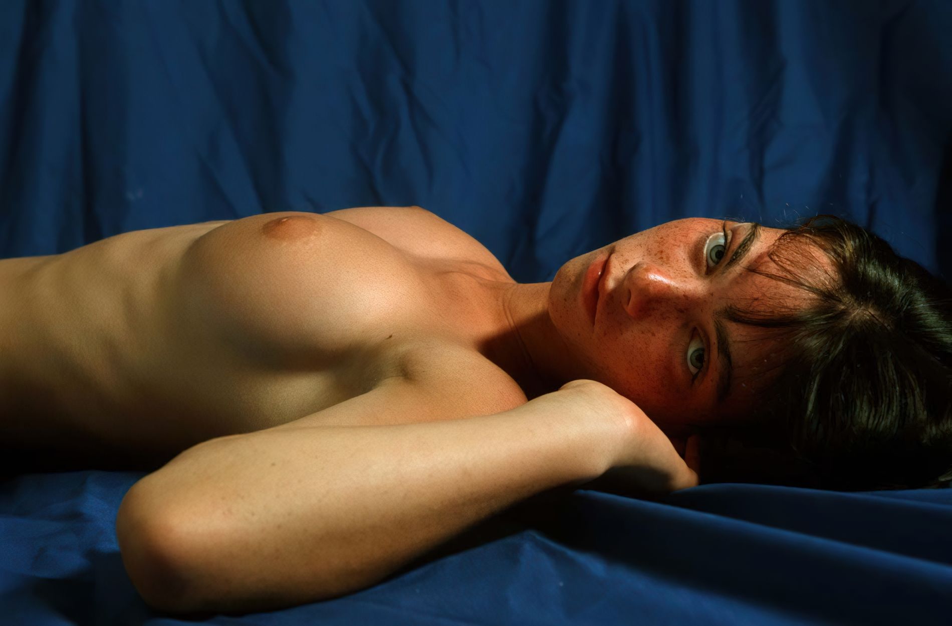 Веснушчатая, но интересная девушка с немного волосатой киской и пышной грудью.