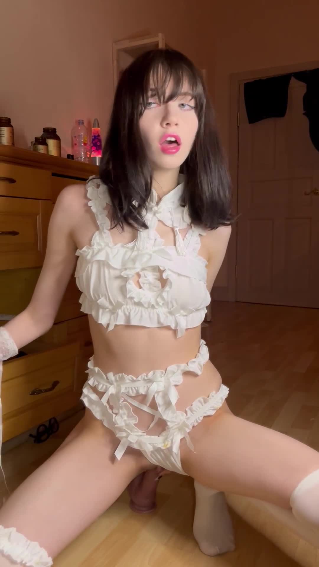 красавица прыгает попкой на члене в белом белье и кончает