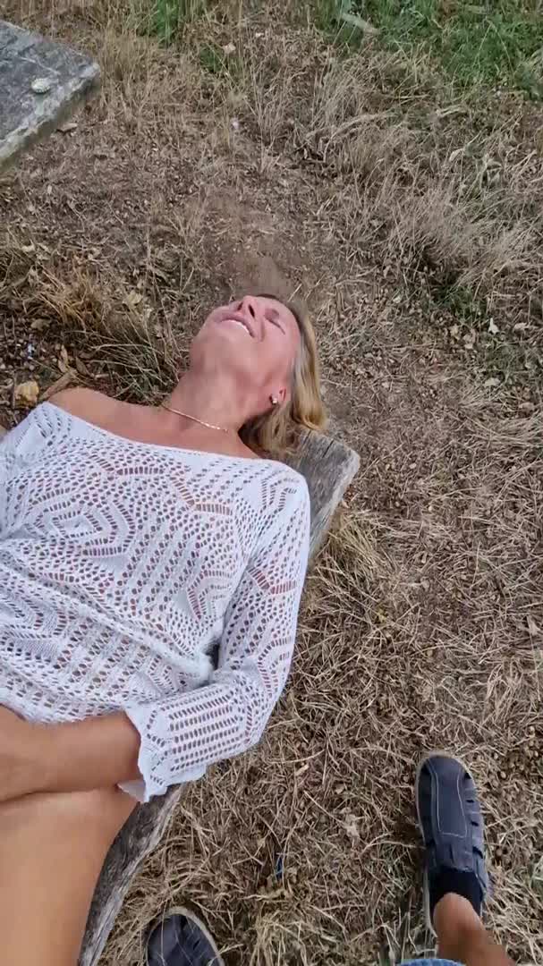 Женщина играет с вибратором на деревянном бревне.
